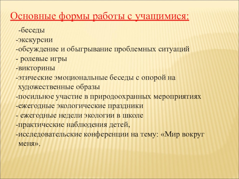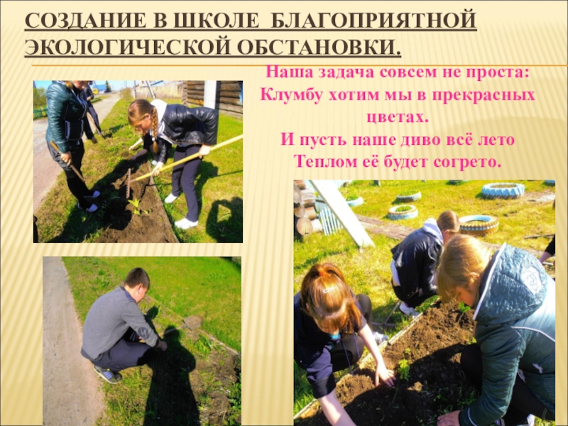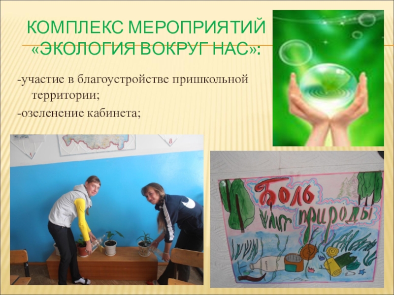 Слайд 25СОЗДАНИЕ В ШКОЛЕ БЛАГОПРИЯТНОЙ ЭКОЛОГИЧЕСКОЙ ОБСТАНОВКИ.