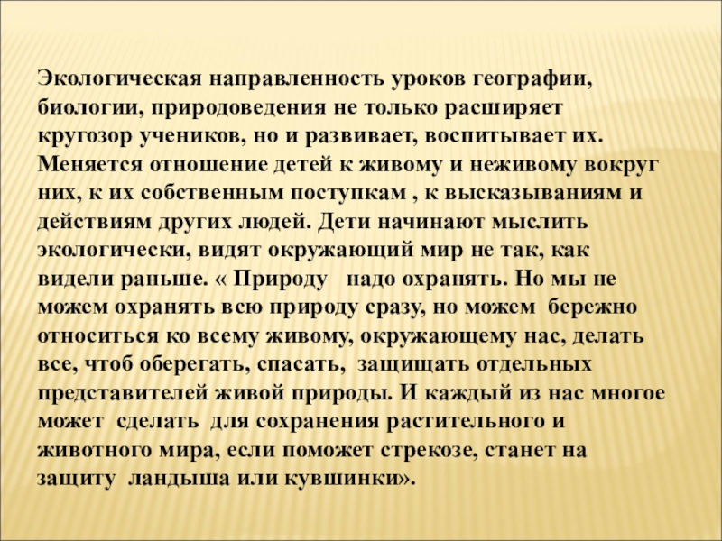 Слайд 31Экологическая направленность уроков географии, биологии, природоведения не только расширяет кругозор учеников,