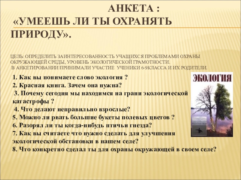 ЦЕЛЬ: ОПРЕДЕЛИТЬ ЗАИНТЕРЕСОВАННОСТЬ УЧАЩИХСЯ ПРОБЛЕМАМИ ОХРАНЫ ОКРУЖАЮЩЕЙ СРЕДЫ, УРОВЕНЬ ЭКОЛОГИЧЕСКОЙ ГРАМОТНОСТИ.