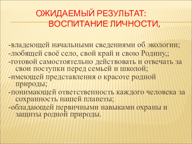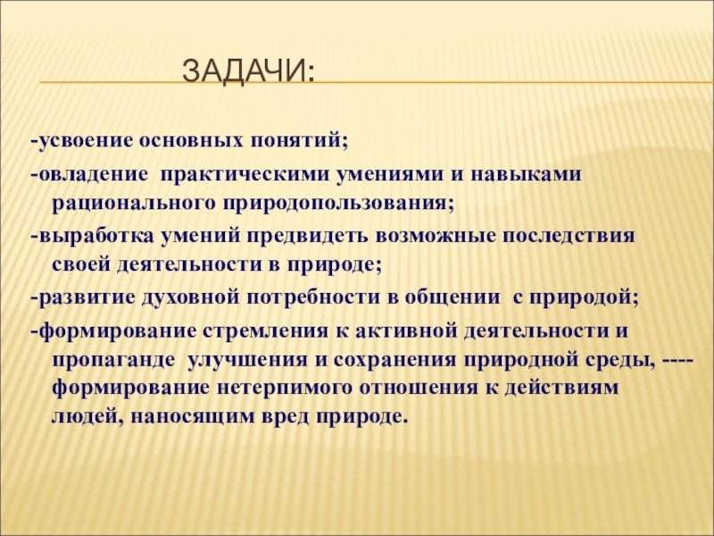 -формирование стремления к активной деятельности и пропаганде улучшения и сохранения природной среды, ----формирование нетерпимого отношения к действиям людей, наносящим вред природе.