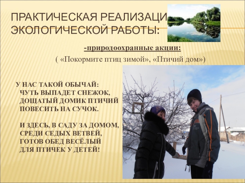 Слайд 24ПРАКТИЧЕСКАЯ РЕАЛИЗАЦИЯ ЭКОЛОГИЧЕСКОЙ РАБОТЫ: