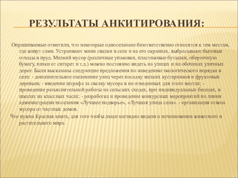 безответственно относятся к тем местам, где живут сами. Устраивают мини свалки в селе и на его окраинах, выбрасывают бытовые отходы в пруд. Мелкий мусор (различные упаковки, пластиковые бутылки, оберточную бумагу, пачки от сигарет и т.д.) можно постоянно видеть на улицах и на обочинах уличных дорог. Были высказаны следующие предложения по наведению экологического порядка в селе: - дополнительное озеленение улиц через посадку мелких кустарников и фруктовых деревьев; - введение штрафа за свалку мусора в не отведенных для этого местах; - проведение разъяснительной работы на сельских сходах, при индивидуальных беседах, в школах на классных часах; - разработка и проведение конкурсных мероприятий по линии администрации поселения «Лучшее подворье», «Лучшая улица села». - организация отвоза мусора от частных домов.