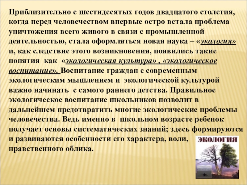 встала проблема уничтожения всего живого в связи с промышленной деятельностью, стала оформляться новая наука – «экология» и, как следствие этого возникновения, появились такие понятия как «экологическая культура» , «экологическое воспитание». Воспитание граждан с современным экологическим мышлением и экологической культурой важно начинать с самого раннего детства. Правильное экологическое воспитание школьников позволит в дальнейшем предотвратить многие экологические проблемы человечества. Ведь именно в школьном возрасте ребенок получает основы систематических знаний; здесь формируются и развиваются особенности его характера, воли, нравственного облика.