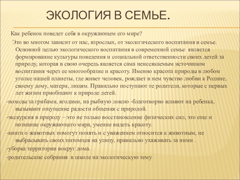 Это во многом зависит от нас, взрослых, от экологического воспитания в семье. Основной целью экологического воспитания в современной семье является формирование культуры поведения и социальной ответственности своих детей за природу, которая в свою очередь является сама неиссякаемым источником воспитания через ее многообразие и красоту. Именно красота природы в любом уголке нашей планеты, где живет человек, рождает в нем чувство любви к Родине, своему дому, матери, людям. Правильно поступают те родители, которые с первых лет жизни приобщают к природе детей.