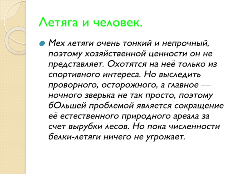 Летяга и человек.Мех летяги очень тонкий и непрочный, поэтому хозяйственной ценности он не представляет. Охотятся на неё