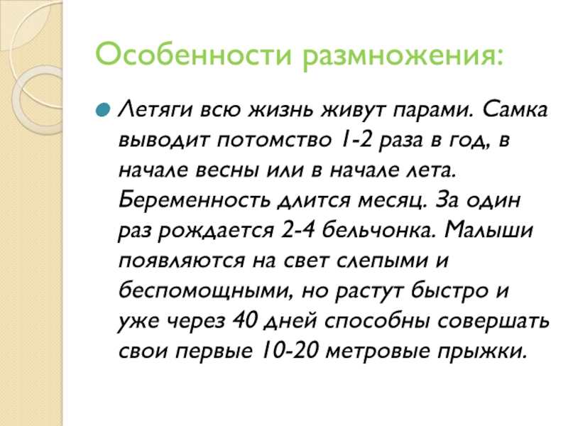 Особенности размножения:Летяги всю жизнь живут парами. Самка выводит потомство 1-2 раза в год, в начале весны или