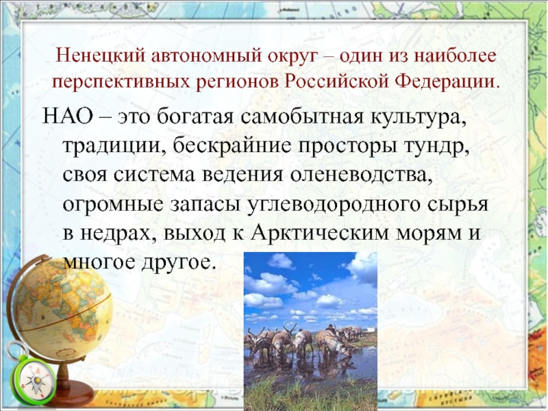 Ненецкий автономный округ – один из наиболее перспективных регионов Российской Федерации.НАО – это богатая самобытная культура, традиции, бескрайние просторы тундр, своя система ведения оленеводства, огромные запасы углеводородного сырья в недрах, выход к Арктическим морям и многое