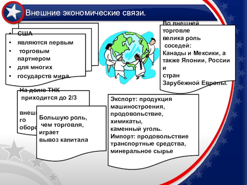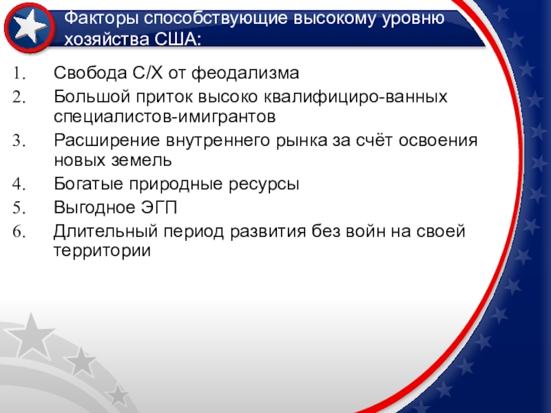 Слайд 14Факторы способствующие высокому уровню хозяйства США:
