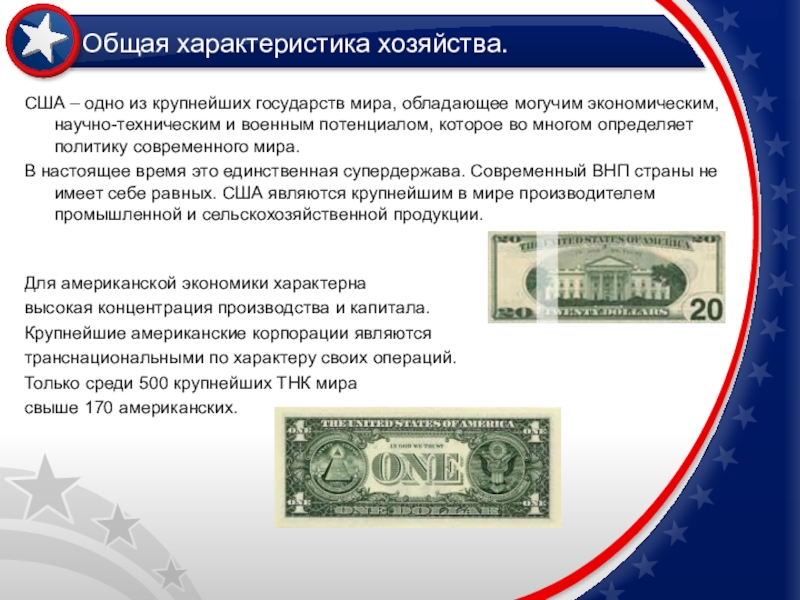 В настоящее время это единственная супердержава. Современный ВНП страны не имеет себе равных. США являются крупнейшим в мире производителем промышленной и сельскохозяйственной продукции.