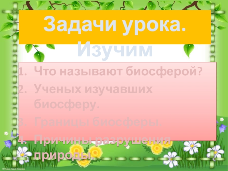 Задачи урока.  Изучим  Что называют биосферой?Ученых изучавших биосферу.Границы биосферы.Причины разрушения природы.