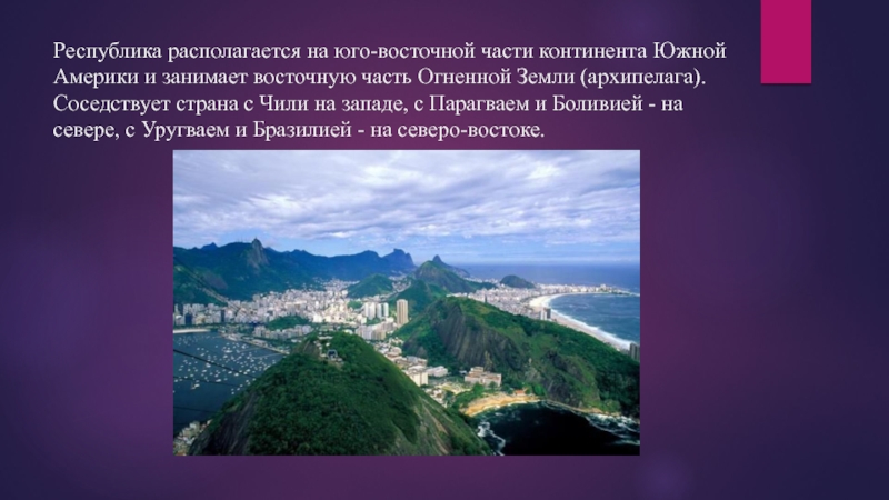 Слайд 4Республика располагается на юго-восточной части континента Южной Америки и занимает восточную