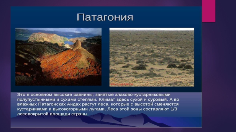 Анды. Анды здесь наиболее высокие. В Аргентине находится самая высокая гора не только Южной Америки а и всего Западного полушария земли. Это гора Аконкагуа ее высота достигает шесть тысяч девятьсот шестьдесят два метра. В восточной части страны находятся равнинные земли Пампы и Гран-Чако и равнинные земли южной части аргентинского побережья Атлантического океана.
