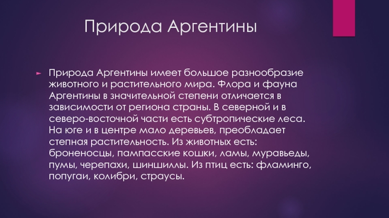 Природа Аргентины имеет большое разнообразие животного и растительного мира. Флора