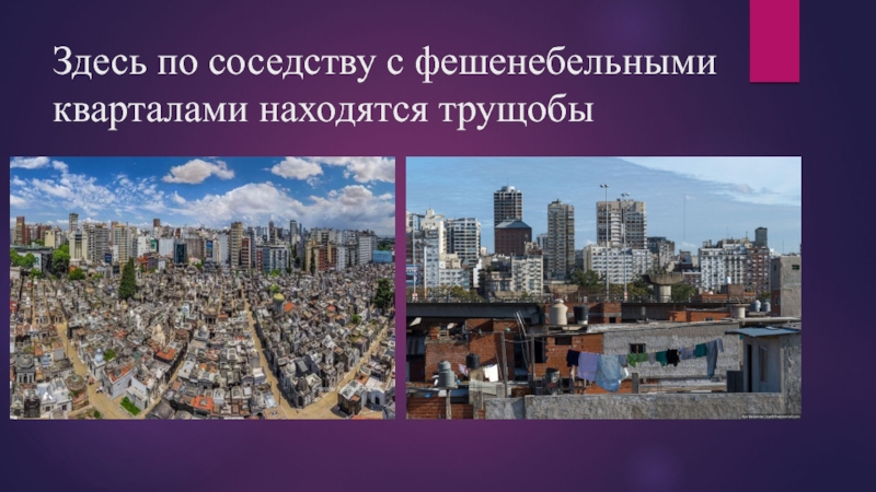 Слайд 7Здесь по соседству с фешенебельными кварталами находятся трущобы