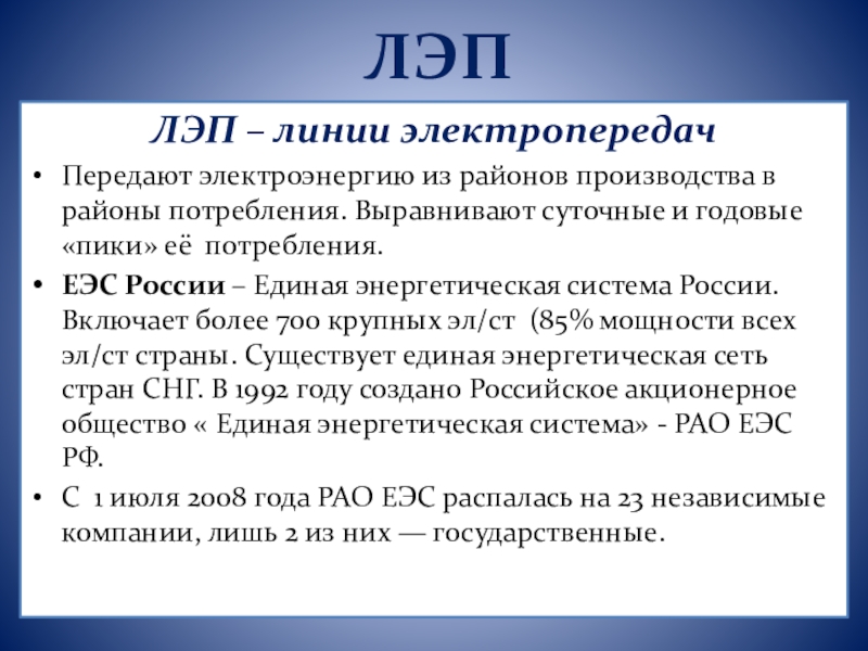 ЕЭС России – Единая энергетическая система России. Включает более 700 крупных эл/ст (85% мощности всех эл/ст страны. Существует единая энергетическая сеть стран СНГ. В 1992 году создано Российское акционерное общество « Единая энергетическая система» - РАО ЕЭС РФ.