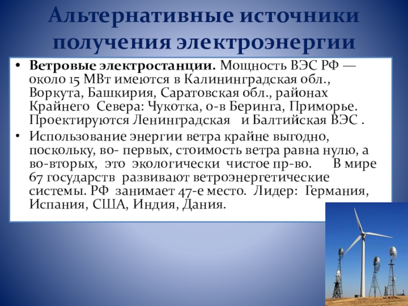Использование энергии ветра крайне выгодно, поскольку, во- первых, стоимость ветра равна нулю, а во-вторых, это экологически чистое пр-во. В мире 67 государств развивают ветроэнергетические системы. РФ занимает 47-е место. Лидер: Германия, Испания, США, Индия, Дания.