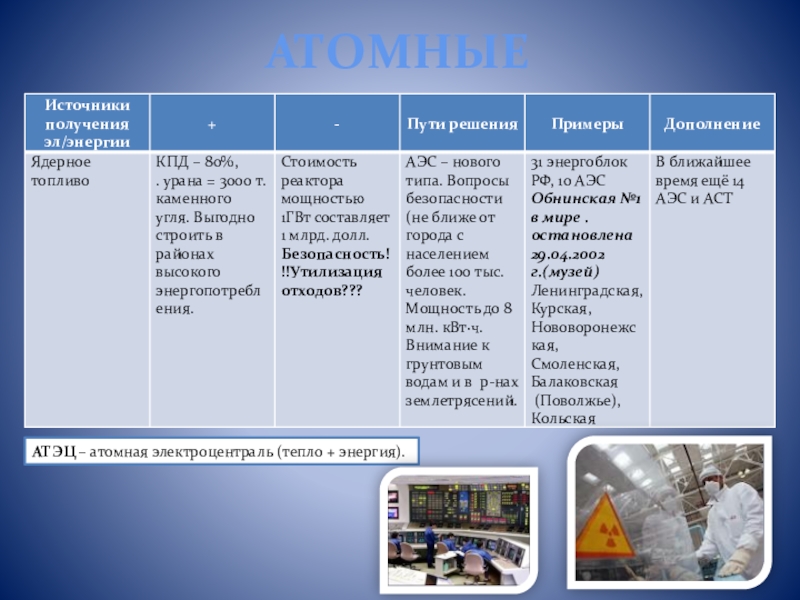 АТЭЦ – атомная электроцентраль (тепло + энергия).