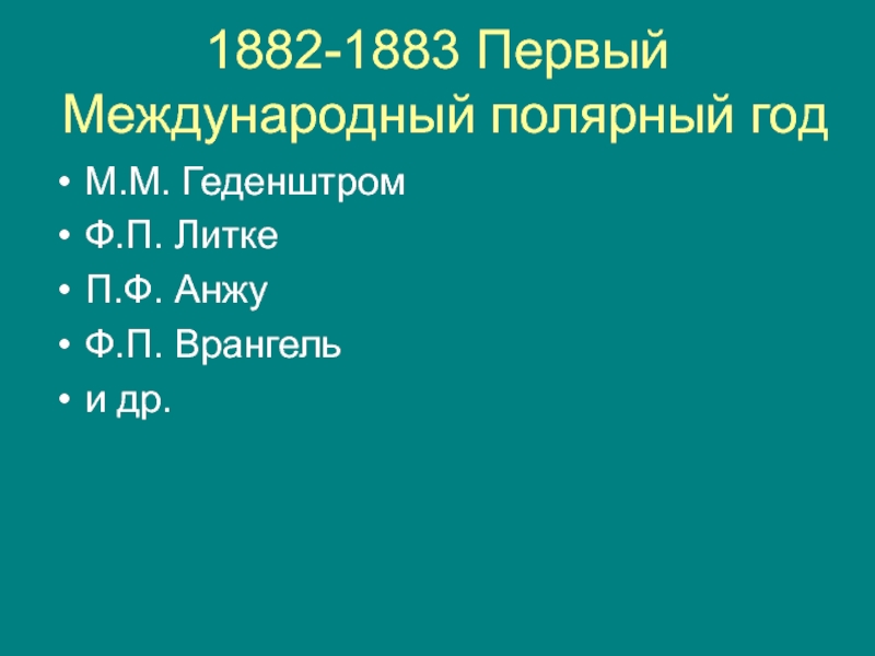 1882-1883 Первый Международный полярный годМ.М. ГеденштромФ.П. ЛиткеП.Ф. АнжуФ.П. Врангель и др.