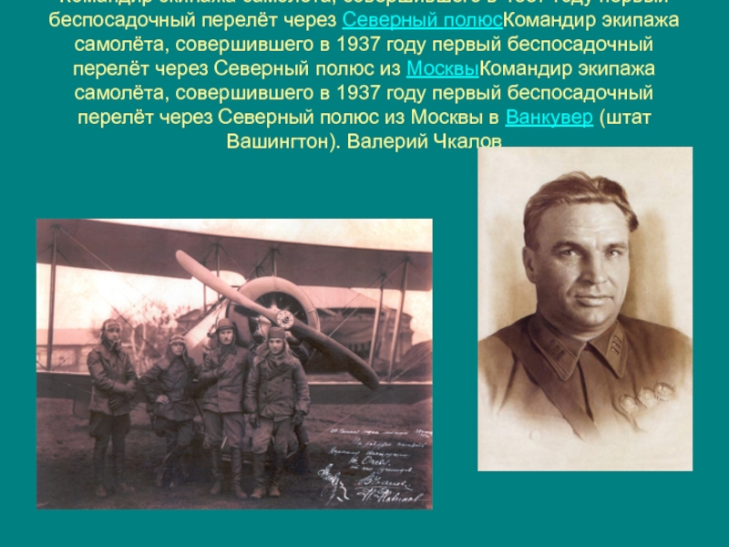 полюсКомандир экипажа самолёта, совершившего в 1937 году первый беспосадочный перелёт через Северный полюс из МосквыКомандир экипажа самолёта, совершившего в 1937 году первый беспосадочный перелёт через Северный полюс из Москвы в Ванкувер (штат Вашингтон). Валерий Чкалов