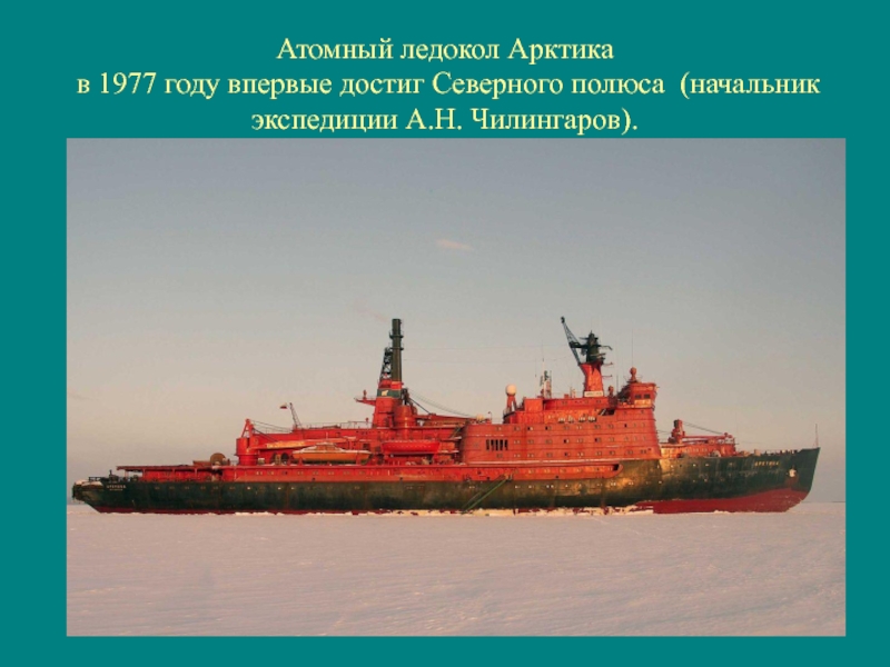 Атомный ледокол Арктика   в 1977 году впервые достиг Северного полюса (начальник экспедиции А.Н. Чилингаров).