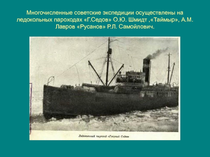Многочисленные советские экспедиции осуществлены на ледокольных пароходах «Г.Седов» О.Ю. Шмидт ,«Таймыр», А.М.Лавров «Русанов» Р.Л. Самойлович.