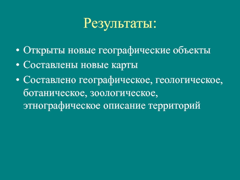 Результаты:Открыты новые географические объектыСоставлены новые картыСоставлено географическое, геологическое, ботаническое, зоологическое, этнографическое описание территорий