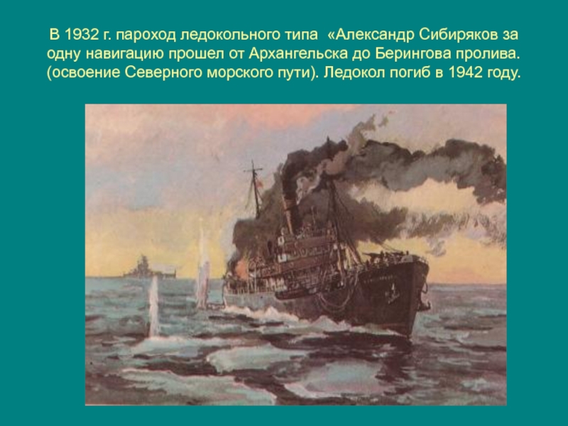 Слайд 20В 1932 г. пароход ледокольного типа «Александр Сибиряков за одну навигацию