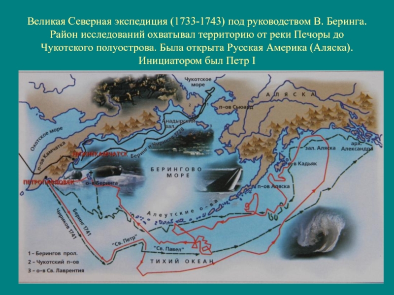 территорию от реки Печоры до Чукотского полуострова. Была открыта Русская Америка (Аляска). Инициатором был Петр I