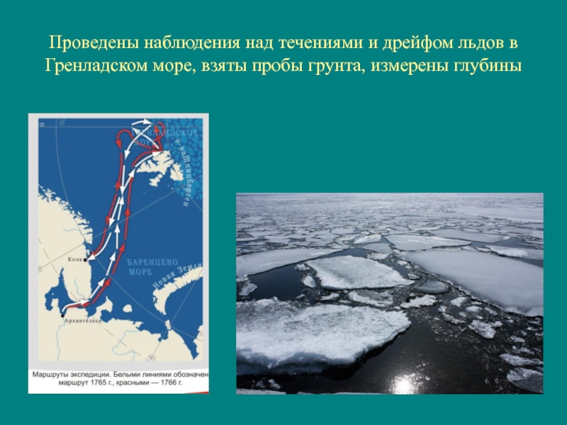 Слайд 14Проведены наблюдения над течениями и дрейфом льдов в Гренладском море, взяты