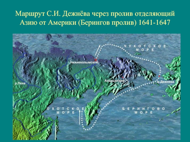 Маршрут С.И. Дежнёва через пролив отделяющий Азию от Америки (Берингов пролив) 1641-1647