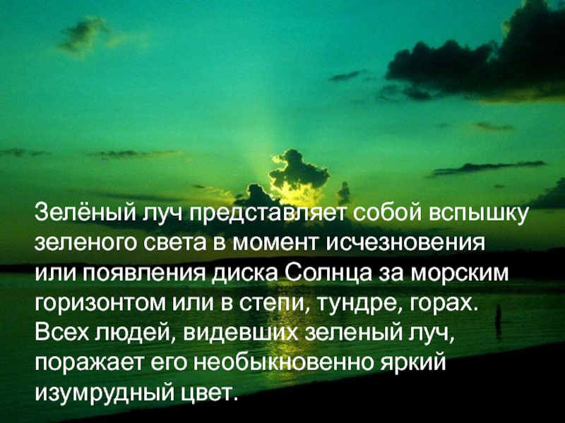 диска Солнца за морским горизонтом или в степи, тундре, горах. Всех людей, видевших зеленый луч, поражает его необыкновенно яркий изумрудный цвет.