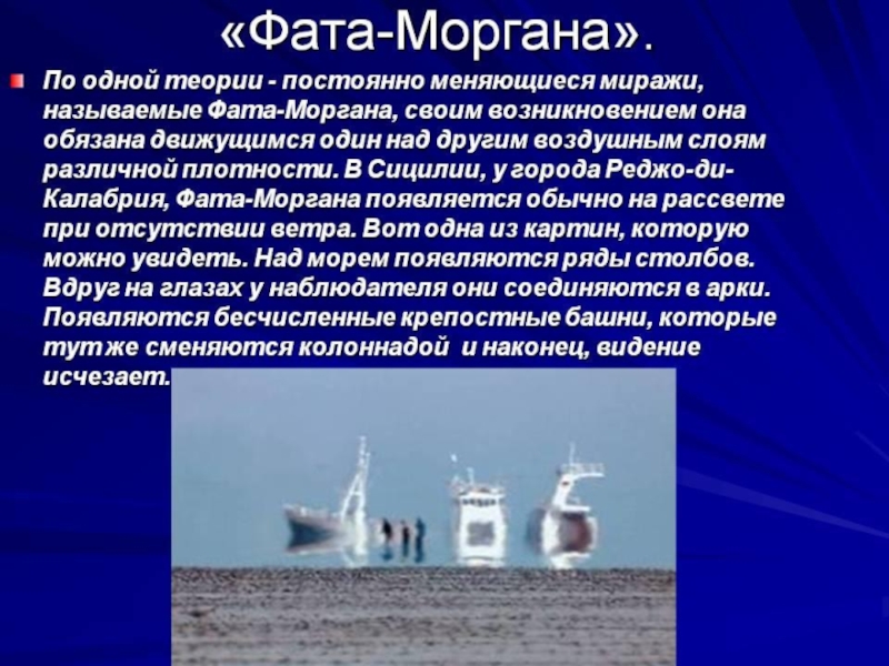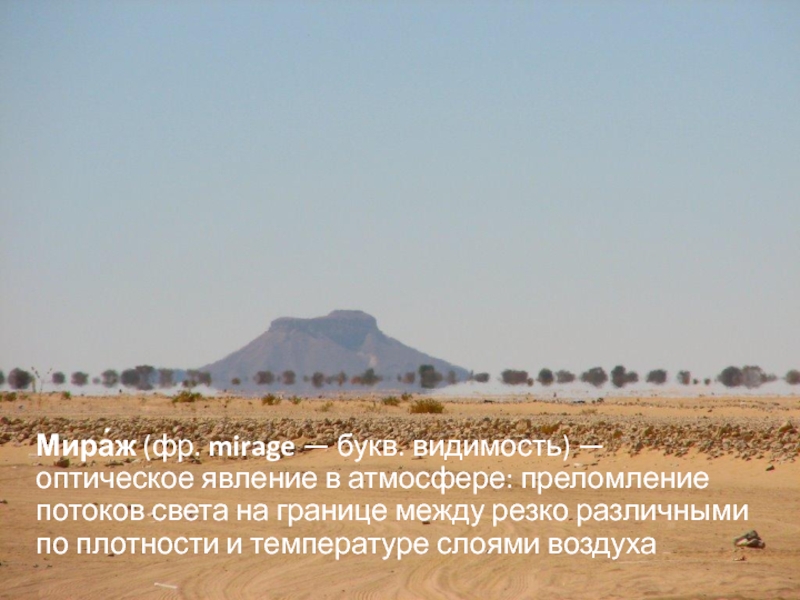 Слайд 4Мира́ж (фр. mirage — букв. видимость) — оптическое явление в атмосфере: преломление потоков света