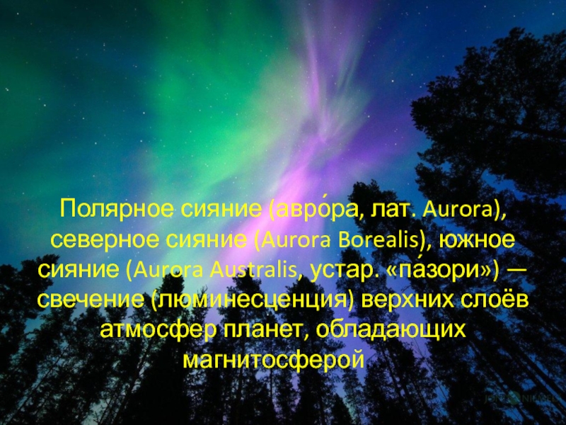 Слайд 13Полярное сияние (авро́ра, лат. Aurora), северное сияние (Aurora Borealis), южное сияние