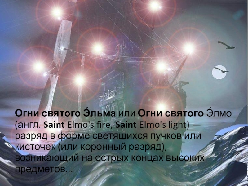 Слайд 7Огни святого Э́льма или Огни святого Э́лмо (англ. Saint Elmo's fire, Saint Elmo's light) — разряд в форме светящихся пучков или