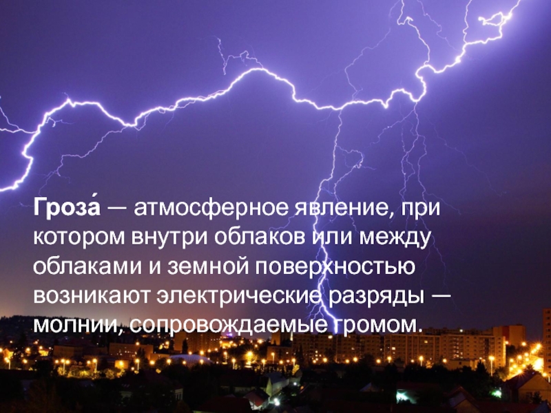 Слайд 2Гроза́ — атмосферное явление, при котором внутри облаков или между облаками и