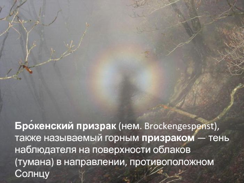 Слайд 9Бро́кенский призрак (нем. Brockengespenst), также называемый горным призраком — тень наблюдателя на поверхности облаков (тумана)