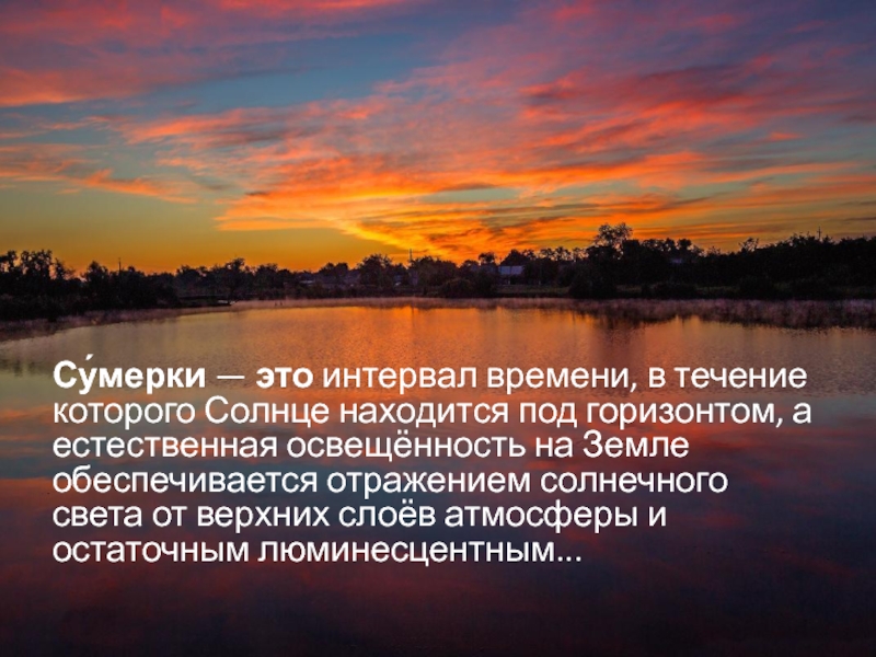 Слайд 5Су́мерки — это интервал времени, в течение которого Солнце находится под горизонтом, а естественная