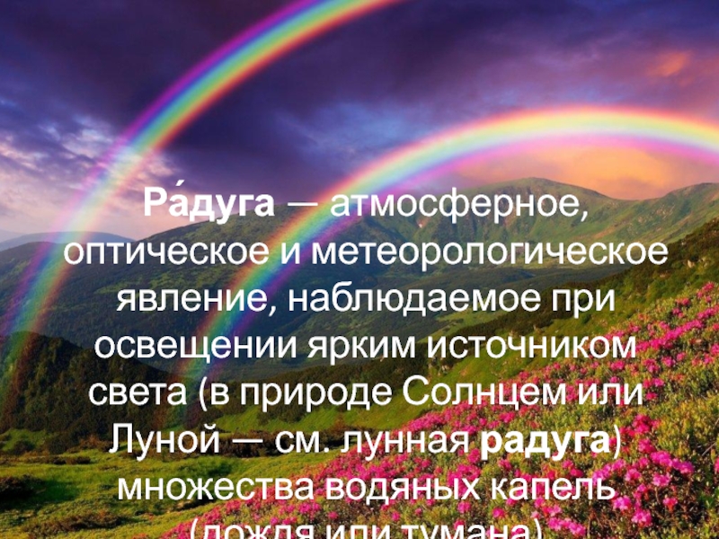 Слайд 3 Ра́дуга — атмосферное, оптическое и метеорологическое явление, наблюдаемое при освещении ярким источником