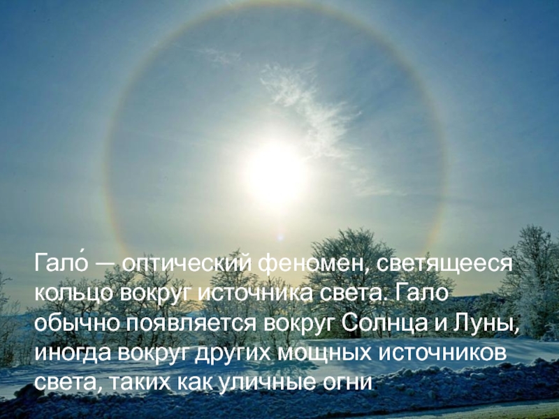 Слайд 12Гало́ — оптический феномен, светящееся кольцо вокруг источника света. Гало обычно