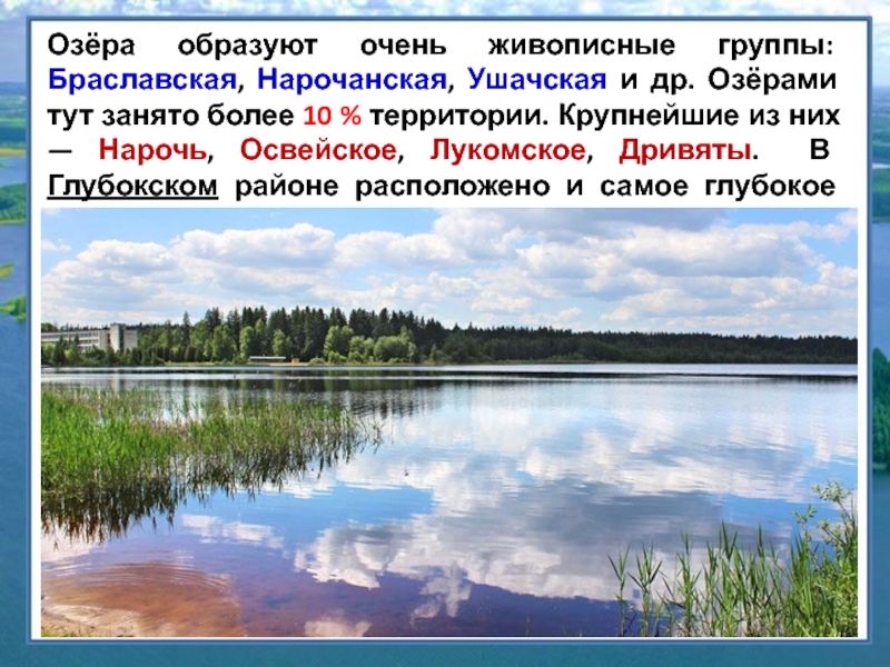 Слайд 17Озёра образуют очень живописные группы: Браславская, Нарочанская, Ушачская и др. Озёрами