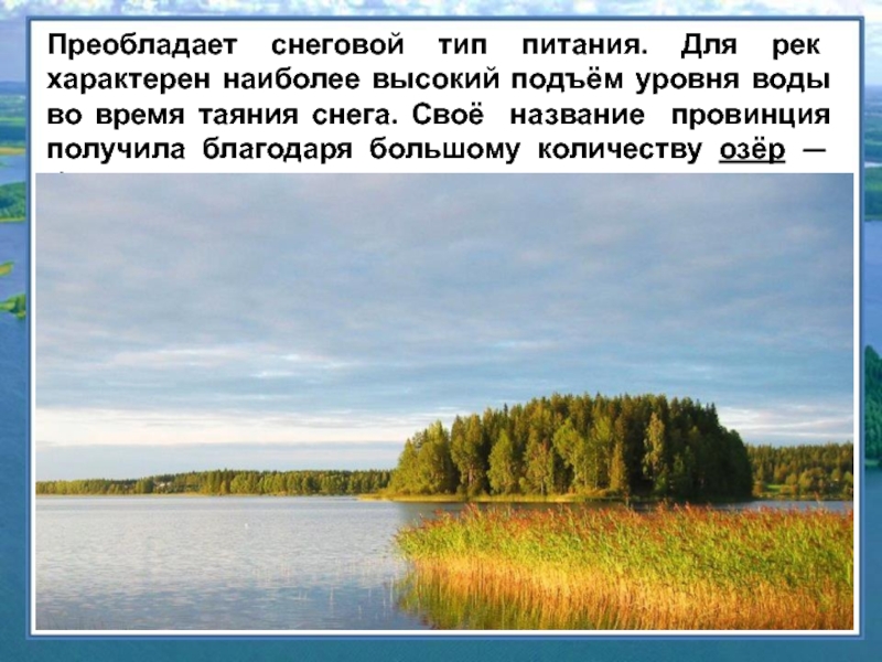 Слайд 16Преобладает снеговой тип питания. Для рек характерен наиболее высокий подъём уровня