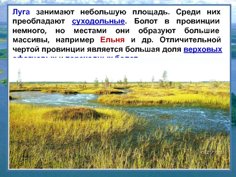 Слайд 21Луга занимают небольшую площадь. Среди них преобладают суходольные. Болот в провинции