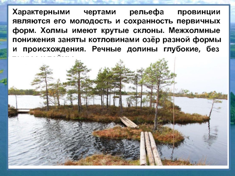 Слайд 9Формирование рельефа связано с деятельностью ледников, особенно поозерского. Поверхность провинции имеет