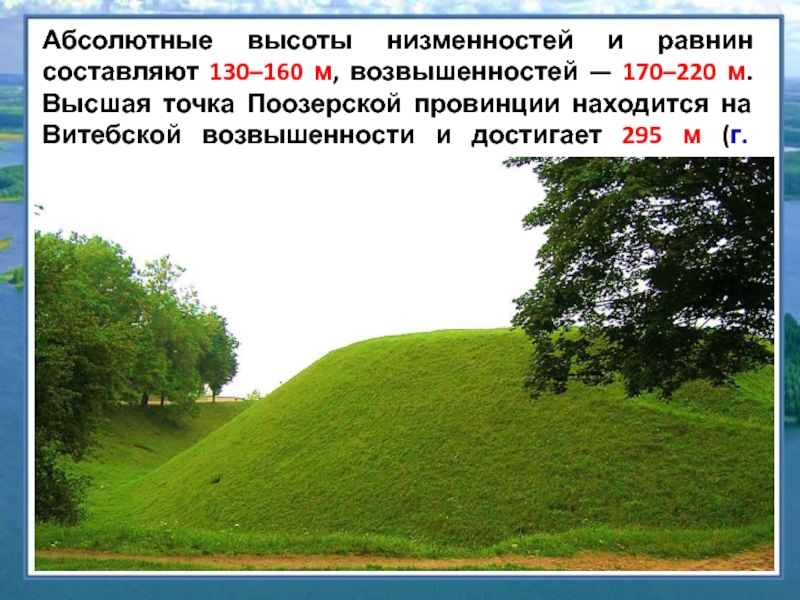 Слайд 10Абсолютные высоты низменностей и равнин составляют 130–160 м, возвышенностей — 170–220
