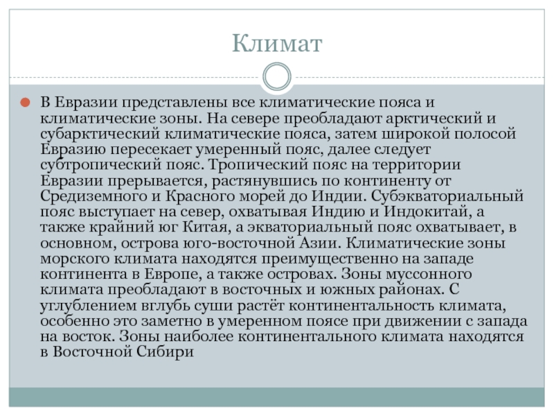 КлиматВ Евразии представлены все климатические пояса и климатические зоны. На севере преобладают арктический и субарктический климатические пояса,