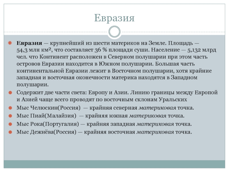 ЕвразияЕвразия — крупнейший из шести материков на Земле. Площадь — 54,3 млн км², что составляет 36 % площади суши. Население — 5,132 млрд