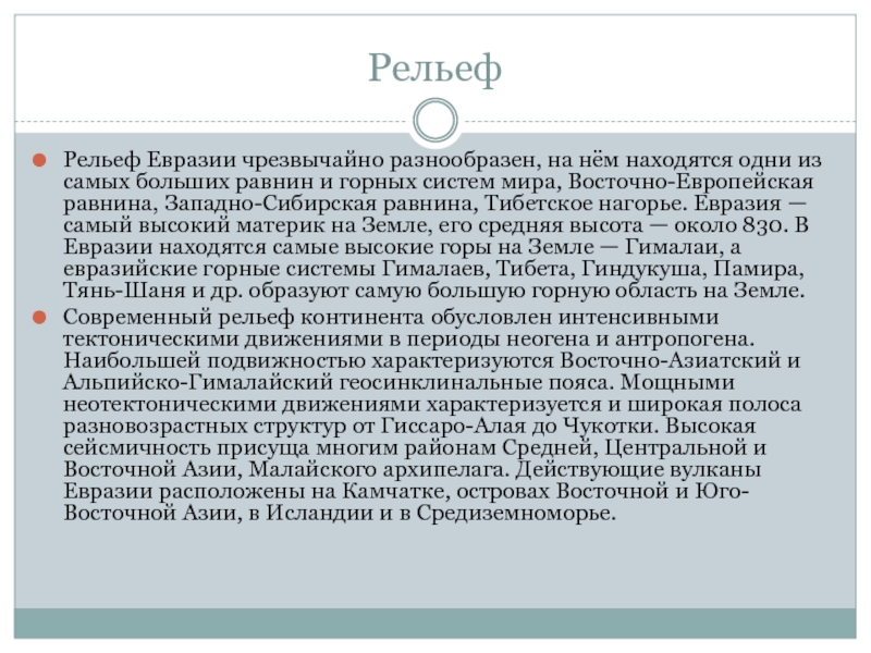 РельефРельеф Евразии чрезвычайно разнообразен, на нём находятся одни из самых больших равнин и горных систем мира, Восточно-Европейская