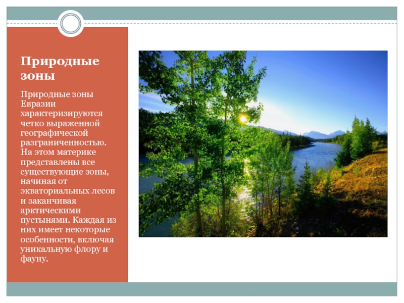 Природные зоны Природные зоны Евразии характеризируются четко выраженной географической разграниченностью. На этом материке представлены все существующие зоны,