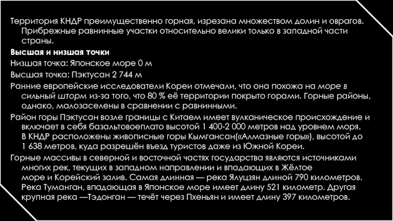 Слайд 5Территория КНДР преимущественно горная, изрезана множеством долин и оврагов. Прибрежные равнинные участки относительно