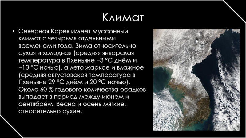 Северная Корея имеет муссонный климат с четырьмя отдельными временами года. Зима относительно сухая